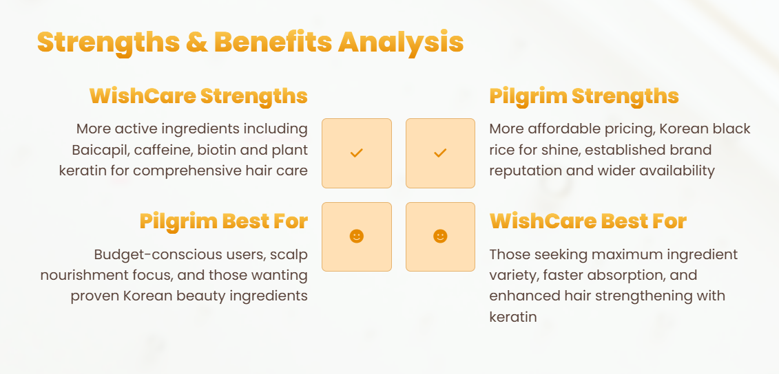 Both of these serums comprise common ingredients such as water, glycerin, and Redynsyl, but Pilgrim is widely recognised for its deodorant properties and hair protection. Whereas WishCare stands out with hair growth stimulation, acne-fighting, lightening, and regenerative effects, giving it a broader functional range.